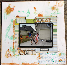 Here is my LO that was inspired by a sketch from Soul Scrappers sketch #141 challenge. I went to town using my mixed media new inks~rusty hinge and cracked pistachio! some package technique, splatters and stamping pulled it all together!